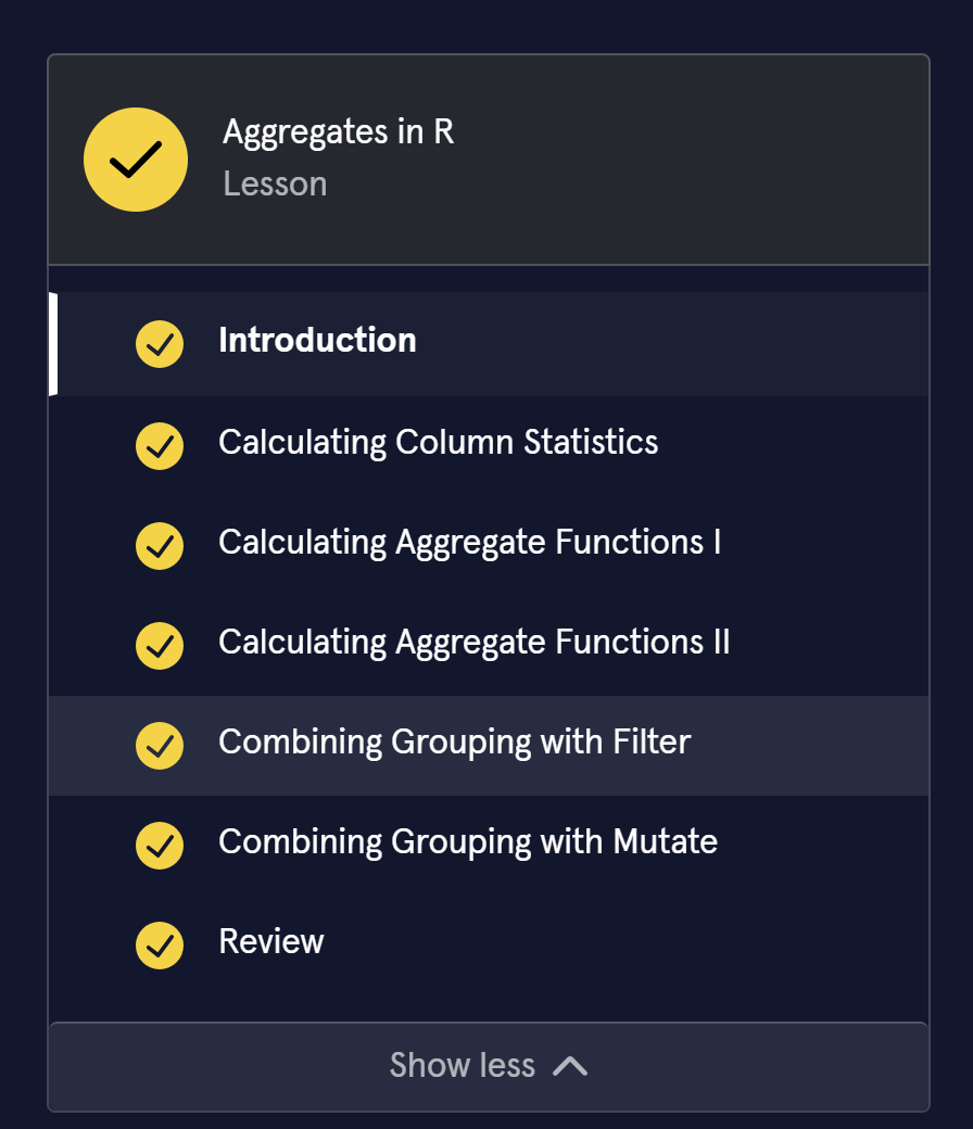 - Codecademy: Aggregates in R: screenshot of completion checkmark (example)