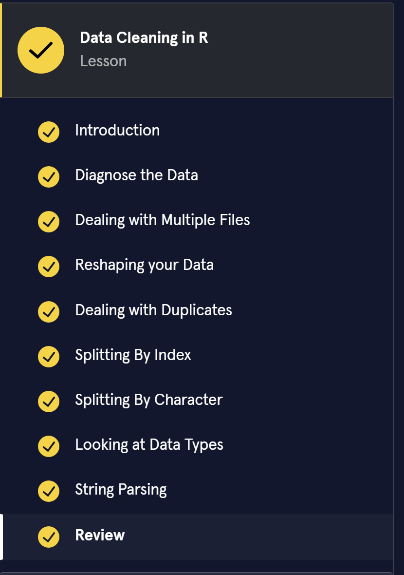 - Codecademy: Data Cleaning in R: screenshot of completion checkmark (example)