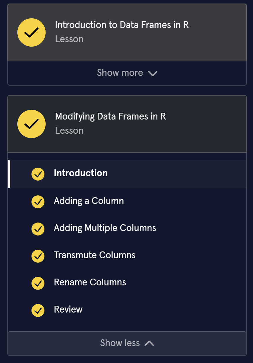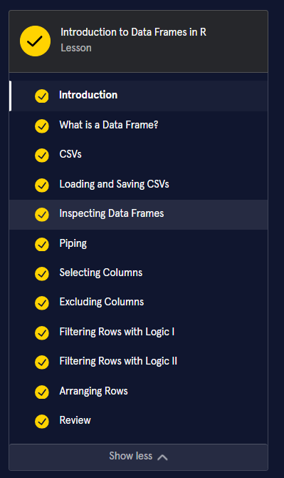 - Codecademy: Introduction to Data Frames in R: screenshot of completion checkmark (example)