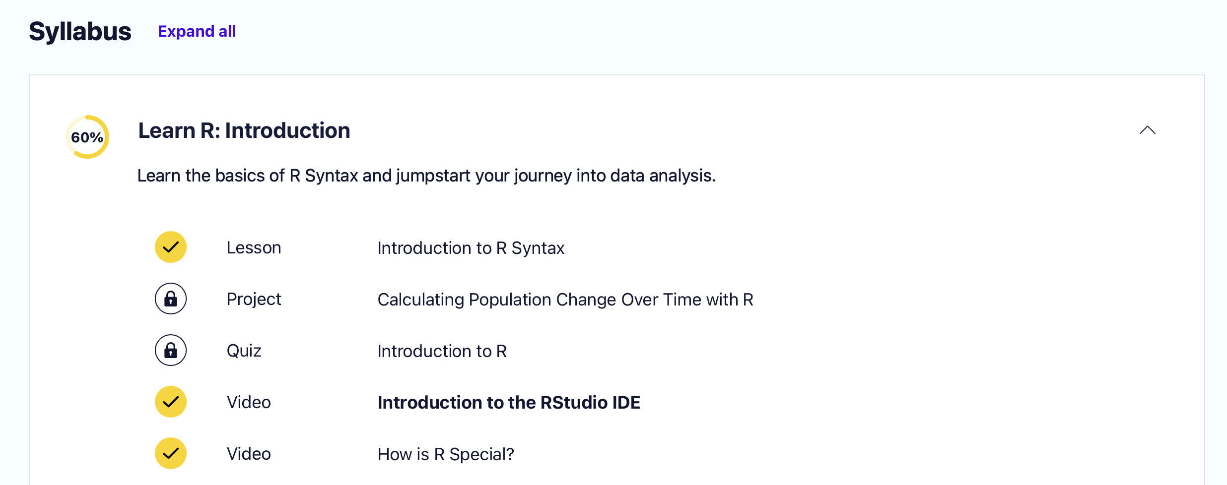- Codecademy: Introduction to R Syntax: screenshot of completion checkmark (example)