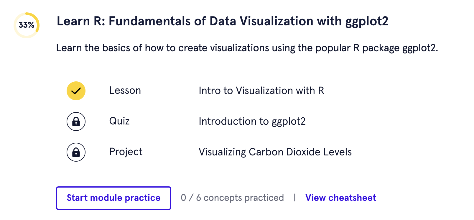 - Codecademy: Introduction to Visualization with R: screenshot of completion checkmark (example)