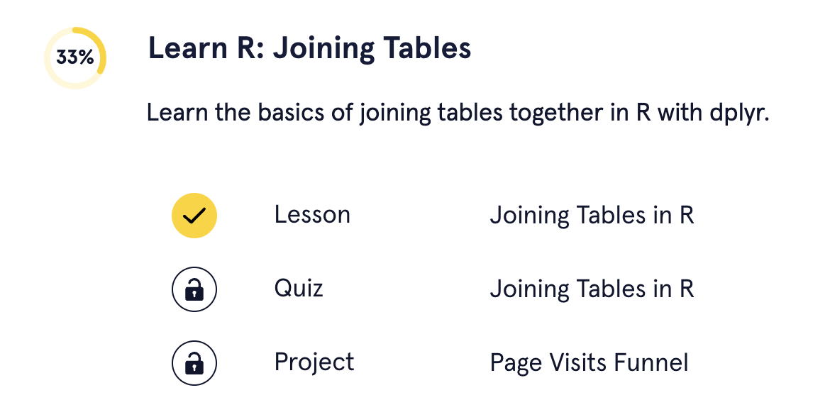 - Codecademy: Joining Tables in R: screenshot of completion checkmark (example)